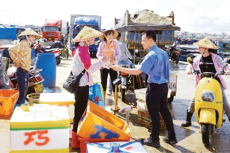 图为2019年8月21日,海南省临高县人民检察院检察官来到新盈湾渔港向渔民宣传法律知识,现场为渔民提供法律咨询服务,并将编印的《法律援助手册》送到渔港渔民手中。 海南省人民检察院供图 胡诗泉/摄